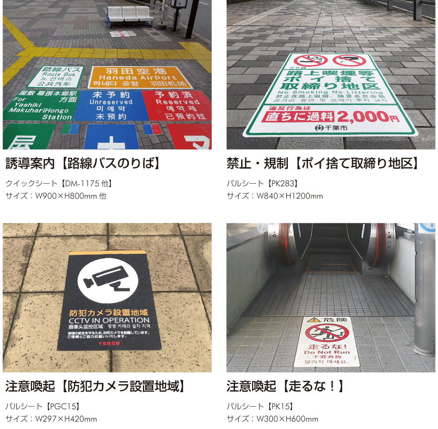 路面標示を用いた対策には、「スムーズに移動できる誘導案内」や「誰にでもわかる注意喚起」があります。